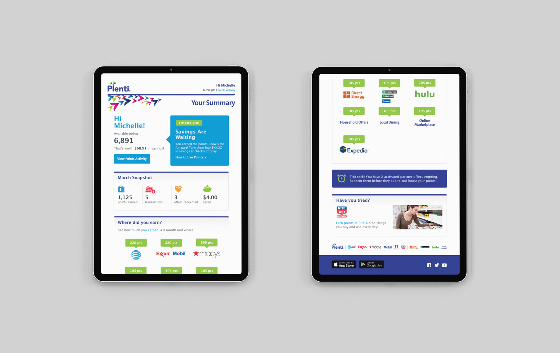 We developed a strategic welcome series of emails featuring simple, clear “how it works” messaging. As the design lead on the account, my team created banner ads, trigger emails based on point usage, a monthly statement, special themed offers, and more.