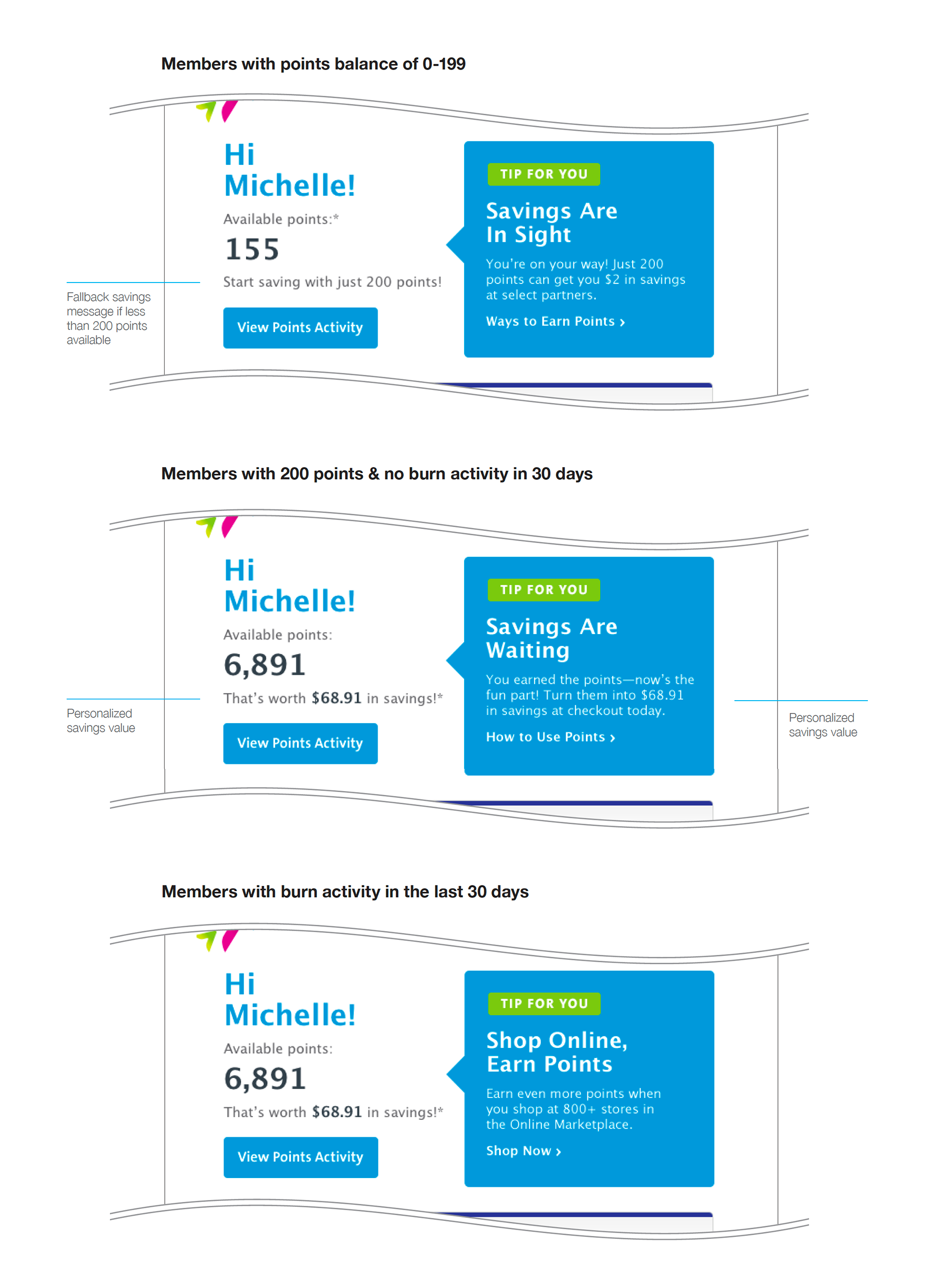 The prominent "Tip For You" directs the member to their next appropriate action based on the members account balance and recent activity. For example, if the members point balance is low (<200) they are reminded they can convert points to savings as soon as they reach 200, thereby encouraging additional point earning behavior such as spending at participating retailers.